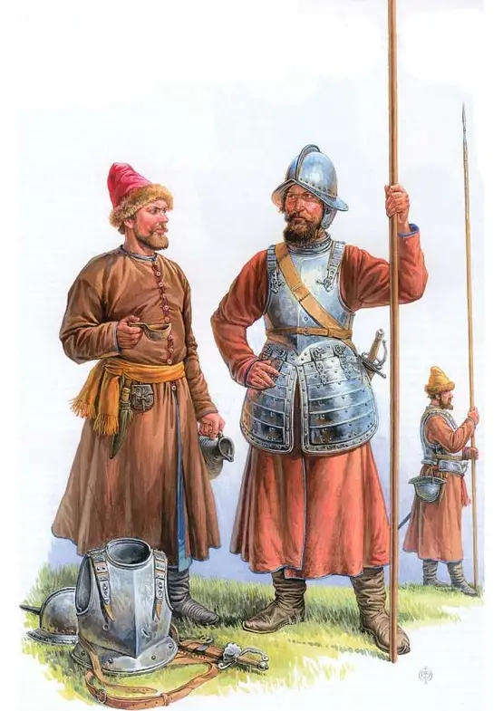 Вот пример того, чем были вооружены на смотру городовые дворяне (правда, он относится к более позднему времени): в полку воеводы Львова в 1645 году из 665 помещиков 425 имели пистолеты (преимущественно один), 44 – карабин, только 16 – карабин и пистолет, 79 – саадак (лук со стрелами), 87 – саблю, 1 – рогатину, 6 – без оружия. Трудно представить, чем в таком случае были вооружены их холопы.