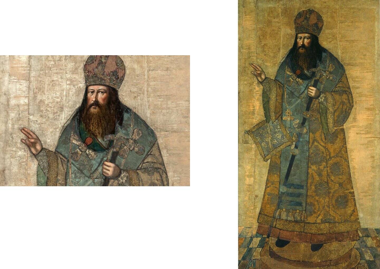 Часто дополнялись изображением пастырского посоха, указывающим на ведущую роль Церкви. Одним из самых известных портретов церковного лидера является портрет Патриарха Иоакима, выполненный мастером Оружейной палаты Карпом Золотаревым. Написанный в смешанной технике, портрет оживляет лицо с помощью светотени, но в то же время плоско, в старой манере, изображает одежды патриарха. Для создания изображения использовались и темпера, и масляные краски.