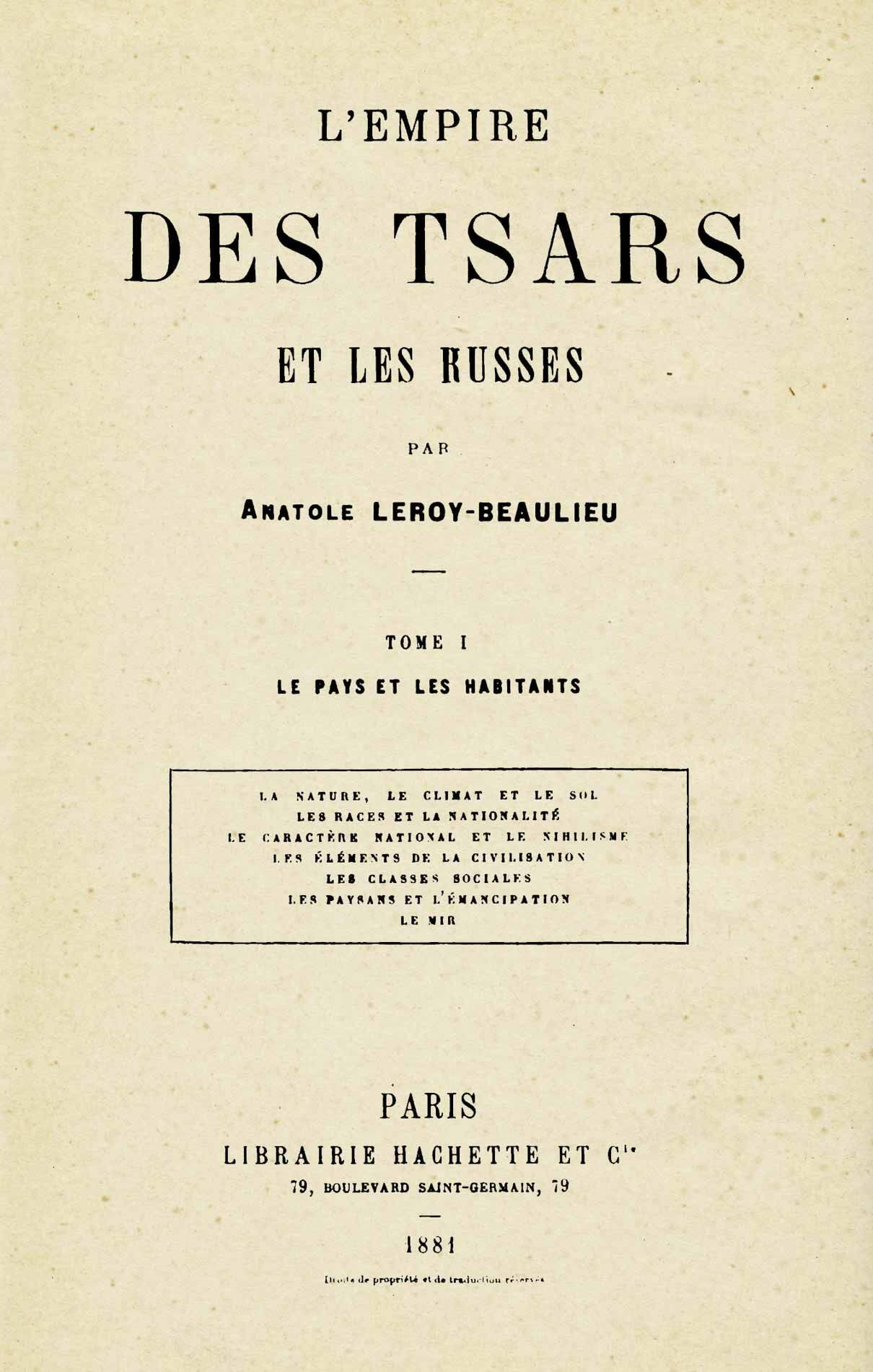 Анатоля Леруа-Больё (1842–1912) называют "французским славянофилом", исследователем, открывшим новый взгляд на Россию и сформировавшим новое направление в россике, а его книгу воспринимают своеобразной антитезой работе маркиза де Кюстина. Так, известный современный франко-швейцарский славист Жорж Нива отмечает: "Французские слависты делятся на два резко отличных типа: настольная книга одних — "Россия в 1839 году" Кюстина <...> другие предпочитают держать под рукой Леруа-Больё".