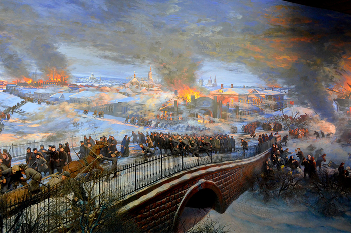 А 17 декабря 1905-го ситуация изменилась коренным образом. На помощь властям прибыл Семёновский полк с пушками. Атака на Пресню началась со всех сторон. 17 декабря в 4 часа утра начался штурм. С Ваганьковского кладбища били снарядами по Пресне. Орудия, установленные за фабрикой Мамонтова, били по району сахарного завода. Пушки, расположенные у Дорогомиловского моста и Новинского бульвара, били по «Трёхгорке», фабрике Шмита, по району Горбатого моста. Орудийная канонада сотрясала мостовые, сносила дома. Горели фабрика Шмита, бани, лесные склады. Над Пресней нависли огромные тучи дыма. За день пушки семеновцев разрушили девять баррикад, сожгли девять жилых домов, спальни Прохоровской мануфактуры, бани Бирюкова. Массированное наступление царских войск, тем не менее не напугали рабочих, отряды отходили организованно. «Пресня горит, но не сдаётся», - говорили с гордостью рабочие. Учитывая сложившуюся обстановку большевики приняли решение прекратить вооруженную борьбу с 18-го и политическую стачку с 19 декабря.