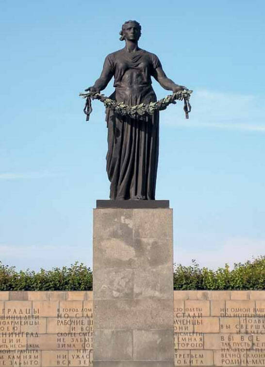 Главный памятник на Пискаревском кладбище — это монумент «Мать - Родина». Она стоит над могилами ленинградцев с венком, вспоминая своих погибших сыновей и дочерей. На верхней террасе Пискаревского мемориала горит Вечный огонь — в память обо всех жертвах блокады и героических защитниках города.