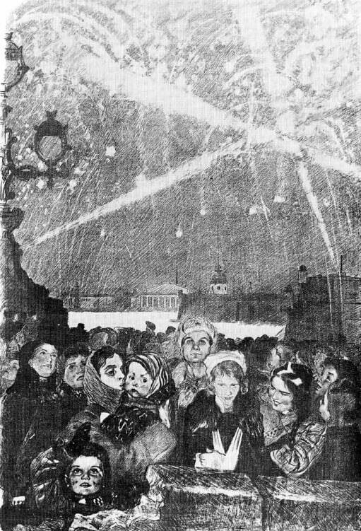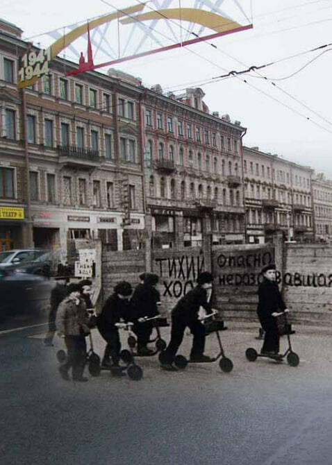Когда заканчиваются ново годние праздники и городские службы снимают украшения и афиши с улиц Петербурга, сразу появляются другие плакаты. Они не такие веселые и разноцветные, как новогодние. На них можно видеть старые фотографии с измученными людьми, пушки и танки на улицах города. Часто на них изображены пере крещенные лучи прожекторов на фоне силуэта Петропавловской крепости, две непонятные дуги разного размера.