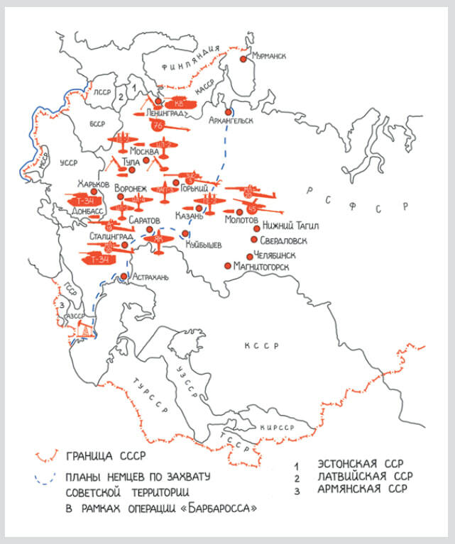 Бóльшая доля оборонной промышленности располагалась в европейской части СССР, и возникла угроза её захвата противником. В этом и заключался план нацистов. Они хотели молниеносным ударом разгромить нашу армию и захватить советские военные заводы, чтобы не дать нашей стране построить новые танки и самолёты. Без оружия Красная Армия не смогла бы нанести ответный удар.