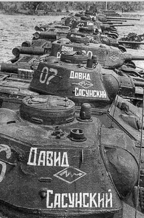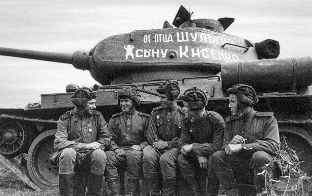Т-34-85 «От отца Шульги сыну Кисенко». Деньги на постройку танка сдал Яков Шульга и передал своему приёмному сыну лейтенанту И.А.Кисенко (на фото он слева). Белый медведь — эмблема 4-го мехкорпуса. Сейчас этот танк стоит