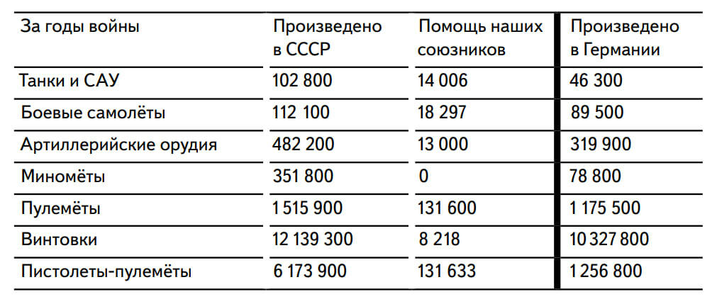 В конце нашего короткого рассказа нужно сказать главное. По всем расчётам нацистов, СССР не мог победить — у Красной Армии просто должны были кончиться танки, пушки и самолёты. Но враг жестоко ошибся. Благодаря умелой организации, блестящим конструкторским решениям и самопожертвованию советского народа Красная Армия воевала далеко не голыми руками. Тыл сумел обеспечить её достаточным количеством оружия. Помощь оказали и союзники. Немцев не «завалили трупами», а завалили сотнями тонн снарядов, пуль, мин и бомб, выпущенных на военных заводах женщинами, стариками и детьми.