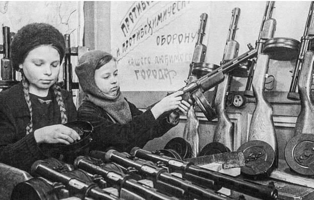 В-пятых, СССР призвал на заводы школьников и женщин. Советский народ с готовностью откликнулся на это, ежедневно совершая трудовой подвиг. Гитлер же пытался до конца войны поддерживать иллюзию хорошей сытой жизни при власти нацистов. Это значит, что женщин и детей на заводы нацисты не призывали, а использовали рабский труд военнопленных и насильно угнанных из СССР советских граждан. Работали они без рвения и при любой возможности старались срывать задания.