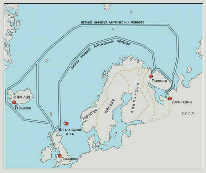 Грузы доставляли разными путями — через Иран, через Владивосток и дальше по Транссибирской магистрали. Но самым быстрым способом (за 10–14 дней) был морской — через Норвежское и Баренцево моря в Архангельск и Мурманск. Архангельск был замерзающим портом. В такой ситуации незамерзающий порт Мурманск оказался незаменим. Но путь к нему был полон опасностей.