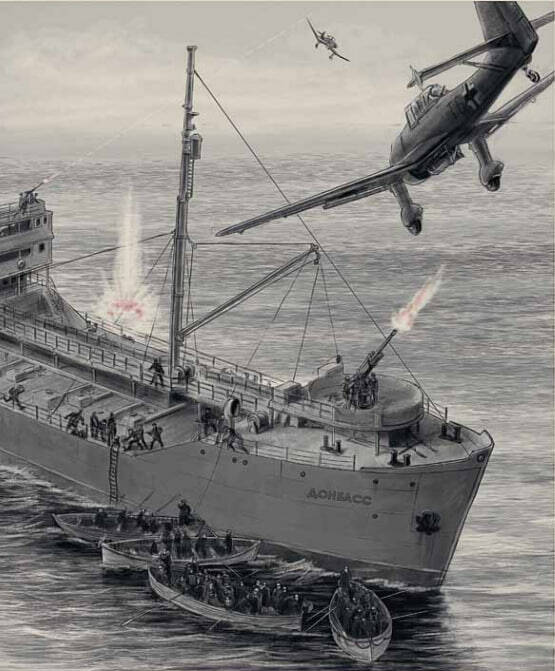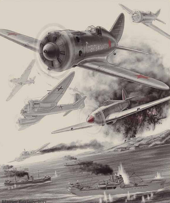 2 июня 1942 г. Тревога: 12 час. 25 мин. Со стороны солнца появились девять «юнкерсов»; они шли высоко по направлению к заливу. Зенитки били по ним здорово, тогда они свернули вправо и потом стали пикировать на залив. Наши «ястребки» были снизу их, но были и сверху; они сразу их атаковали. Тревога длилась минут сорок.