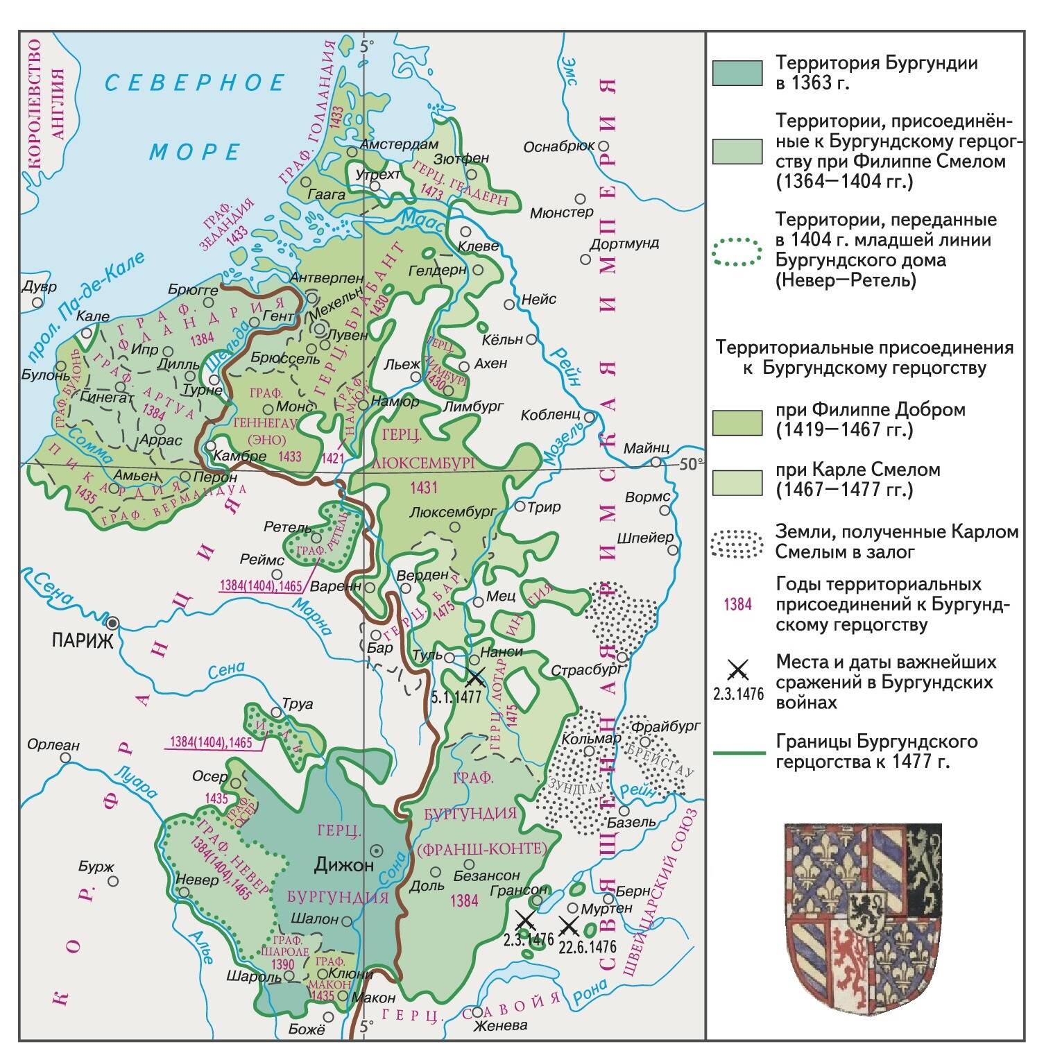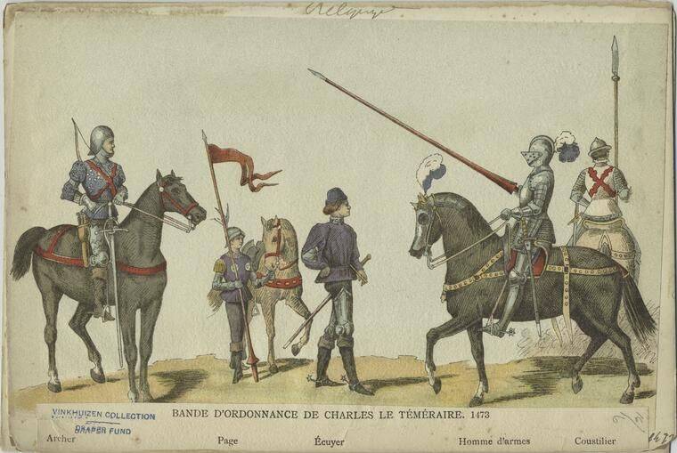 Но чтобы добиться этих результатов, бургундское государство прошло долгий путь. Начался этот путь в далеком 1364 году, когда занявший престол графства Бургундия Филипп Смелый (годы жизни 1342-1402 г.) занялся организацией обороны своего нового владения. Из записей, сохранившихся в архивах Дижона мы знаем, что в его владениях был всего один рыцарь-баннерет (крупный феодал, обладавший правом выходить в военный поход под собственным знаменем и содержать собственный отряд). Помимо того, герцогу служило 139 рыцарей-башелье или бакалавров (имевших право сражаться только под чужими знамёнами и примыкавших к отрядам баннеретов), 105 оруженосцев (в значении представителей благородных семей, еще не получивших рыцарского посвящения, в некоторых случаях оруженосцами служили и не дворяне), функционально выполнявших ту же роль, что и рыцари, и также 19 конных лучников. Эта скромная цифра, конечно, не означала, что все войско Бургундии в 1364 году состояло из 259 человек. За каждым из записанных воинов стоял небольшой личный отряд, а за самим Филиппом – его личная гвардия. Но тем не менее, военная сила небольшого графства не могла превышать нескольких тысяч человек, а отсутствие внешних угроз не требовало ее немедленного наращивания.