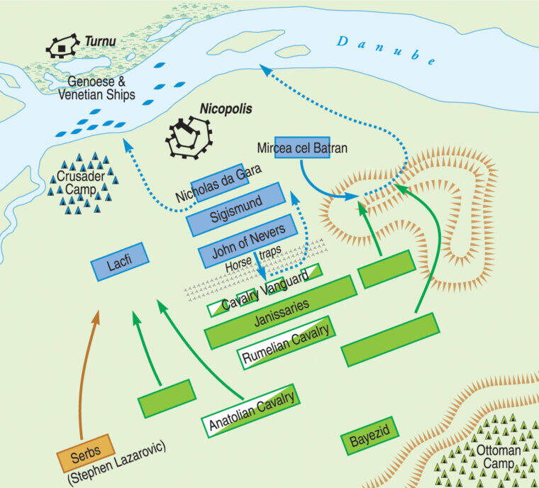 Не способный к долгой атаке рыцарский отряд, одолев первую линию всадников и предполагая, что вся османская армия обращена в бегство, поднялся на холм и встретился в резервами армии Баязида: сразу же за строем легкой конницы, на холме, была выстроена османская пехота. Окопавшейся на возвышении пешие воины обстреляли рыцарей из луков, встав за несколькими рядами врытых в землю кольев. Несмотря на то, что стрела не могла серьезно повредить закованному в доспех всаднику и его коню, при массированном обстреле часть воинов и их лошади все-же получали ранения и выбывали из битвы. Вместе с этим вкопанные в землю колья также ранили лошадей и останавливали напор рыцарской конницы.