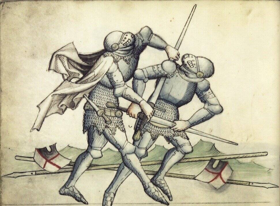 Борцовский прием с мечом, манускрипт Gladioatoria, ок. 1440 года. Можно заметить характерную форму нагрудников и то, насколько большую роль в защите подмышек, живота и бедер продолжает играть кольчугаИсточник: manuscriptminiatures.comКак все это стало возможным?