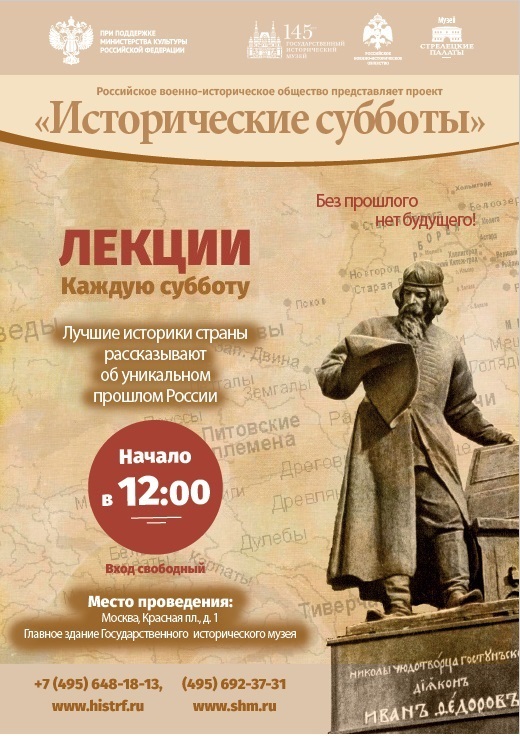 Государственный исторический музей, Российское военно-историческое общество (РВИО) при поддержке Министерства культуры Российской Федерации осуществляют образовательный проект - лекторий «Исторические субботы». Он посвящен как известным, так и малоизученным страницам прошлого России.